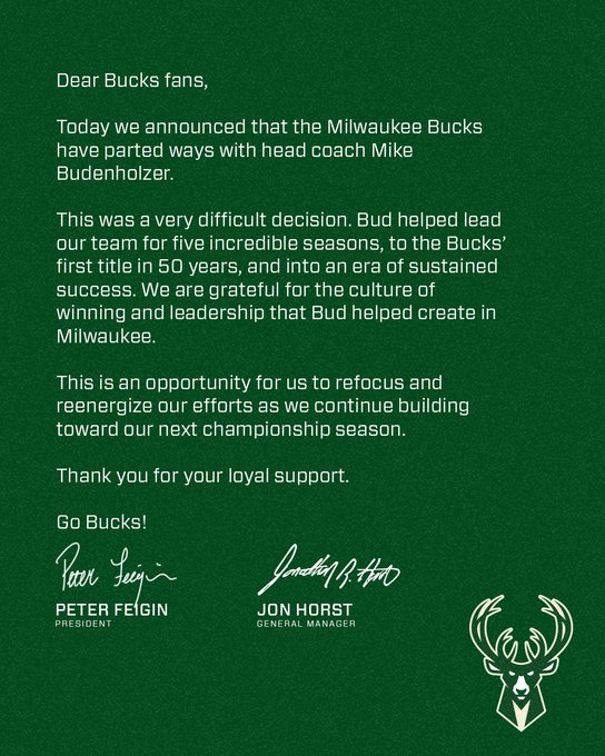 In their statement, Horst and Feigin expressed their appreciation for Budenholzer’s contribution to the team’s success over the past five seasons.