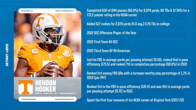 Detroit Lions drafted University of Tennessee QB Hendon Hooker in Friday’s 2023 NFL Draft’s third round. Hooker was chosen with the 68th overall pick, making him their highest-drafted QB since 2009.